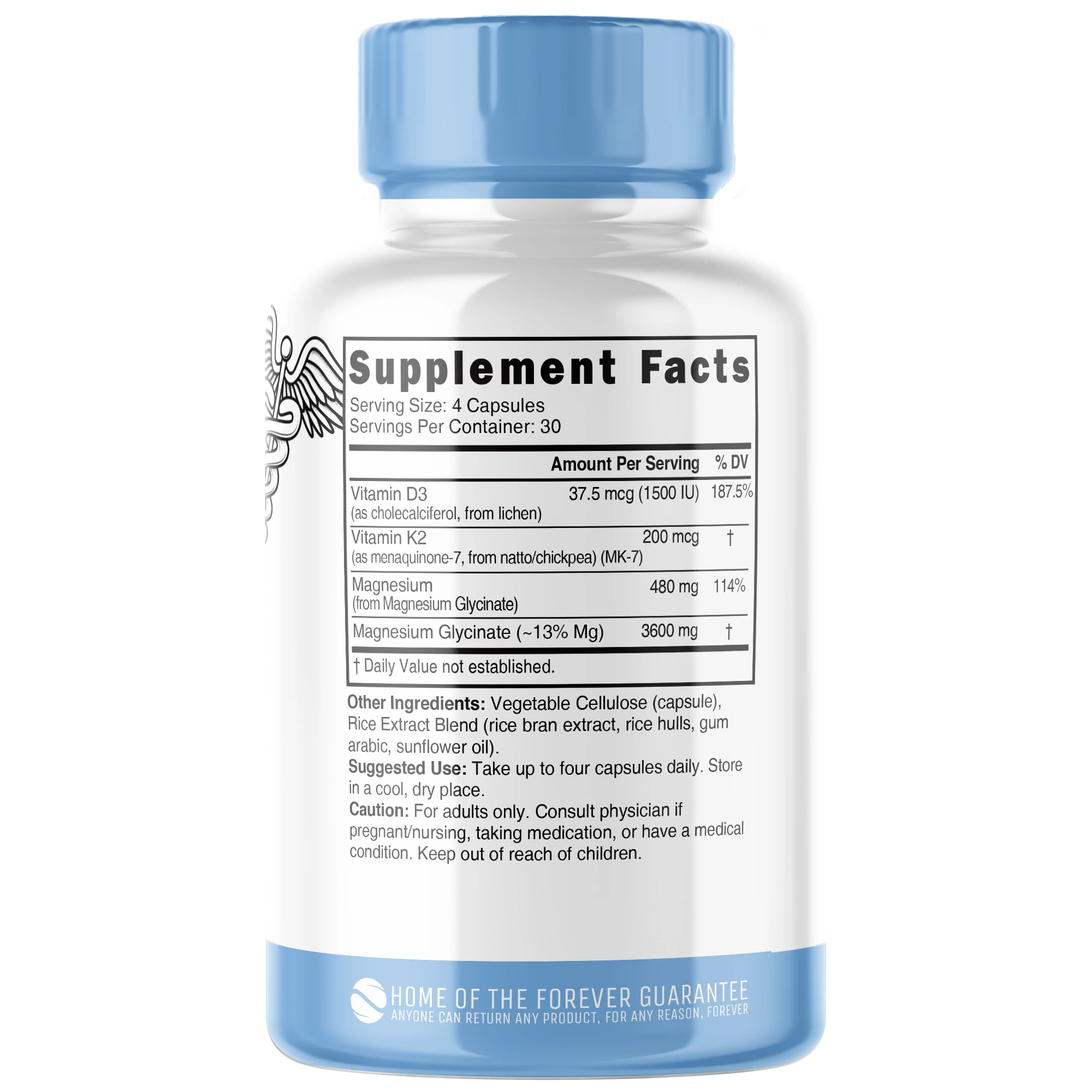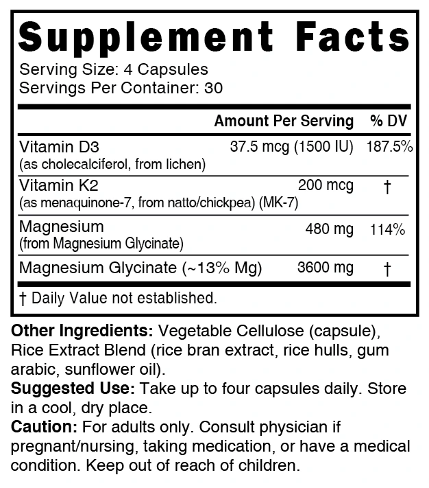 Each serving contains 1500 IU Vegan D3, 200mcg vegan K2, and 480 mg Magnesium (from 3600mg Magnesium Glycinate)