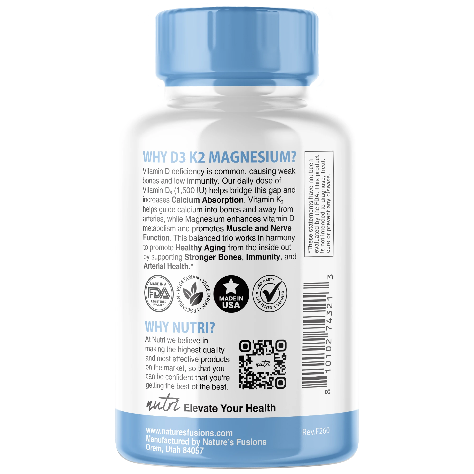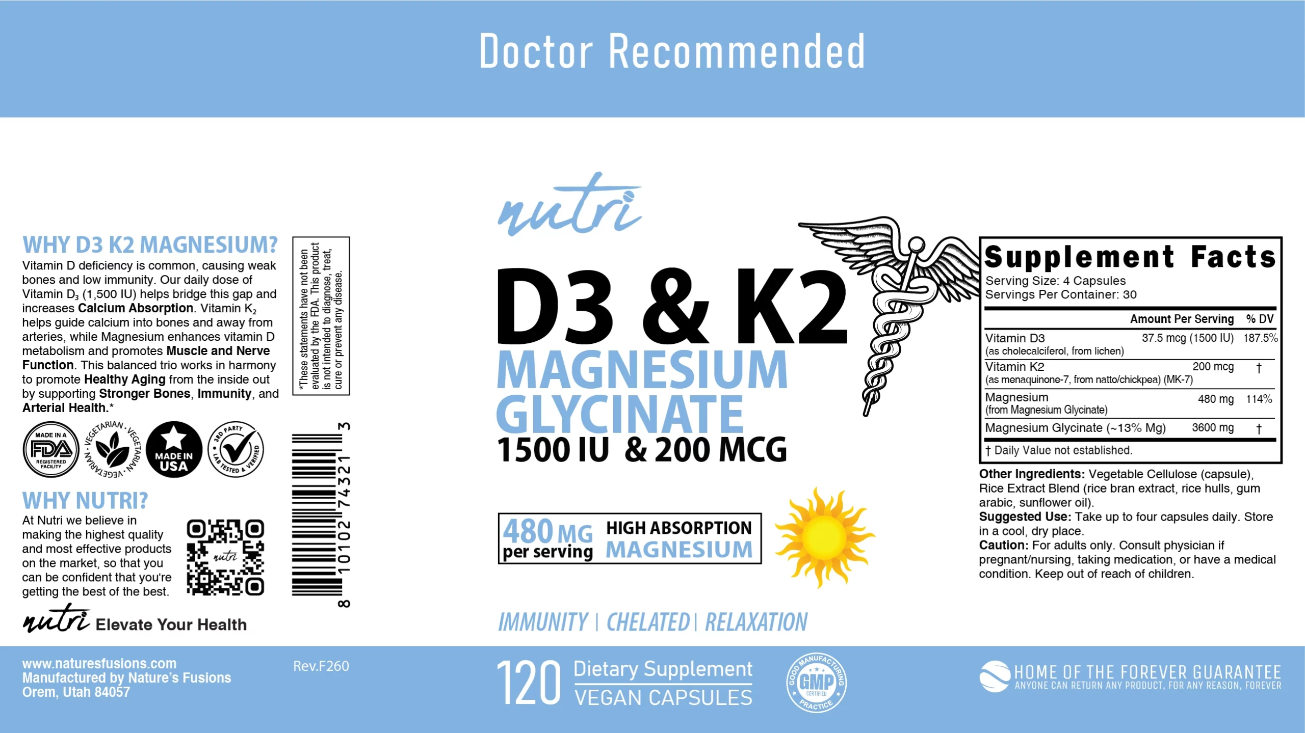 3rd party Lab Tested in the USA: We have our own FDA registered Food-Grade facility in the USA. All our products are 3rd-Party tested to guarantee purity. Satisfaction Guaranteed: At Nutri we guarantee almost everything Forever.