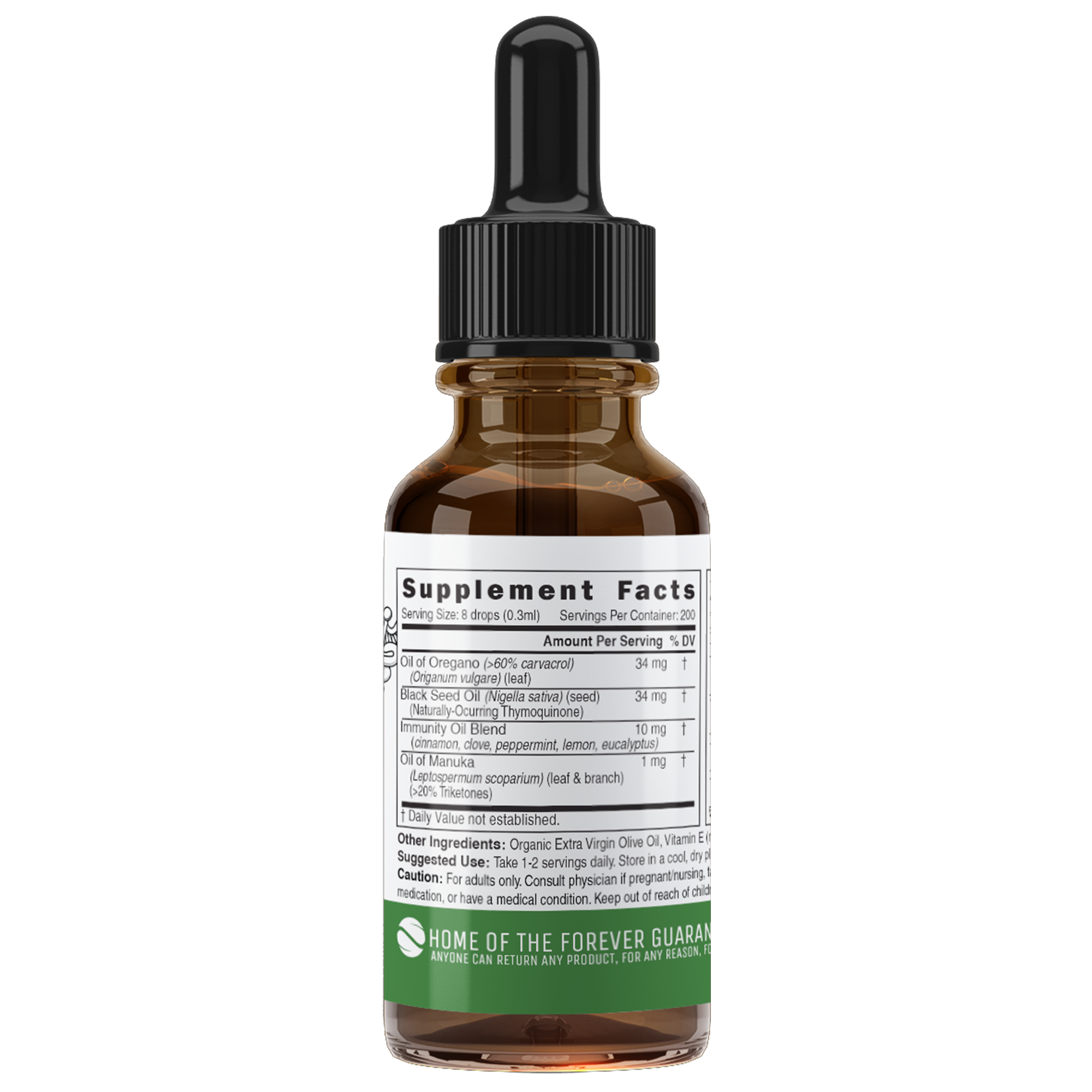 Directions: “Take 1-2 servings daily. Place 8 drops under your tongue, hold for 20 seconds and swallow. Oregano is a “hot” oil, so it has a slight burning sensation. Store in a cool, dry place.”