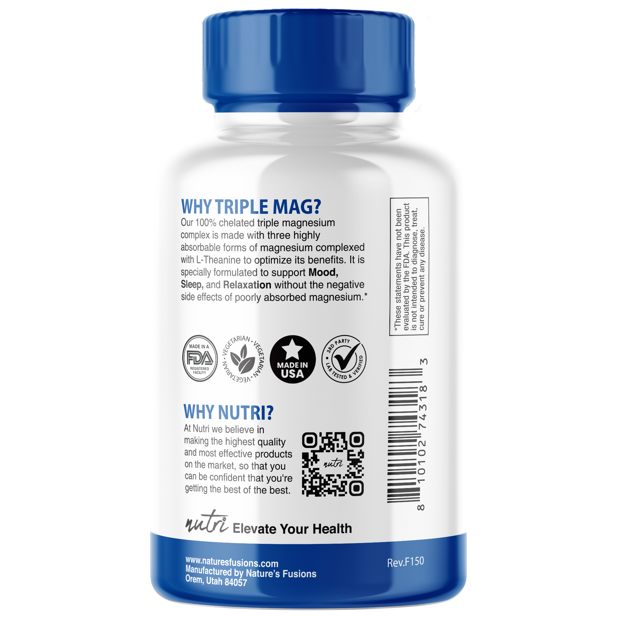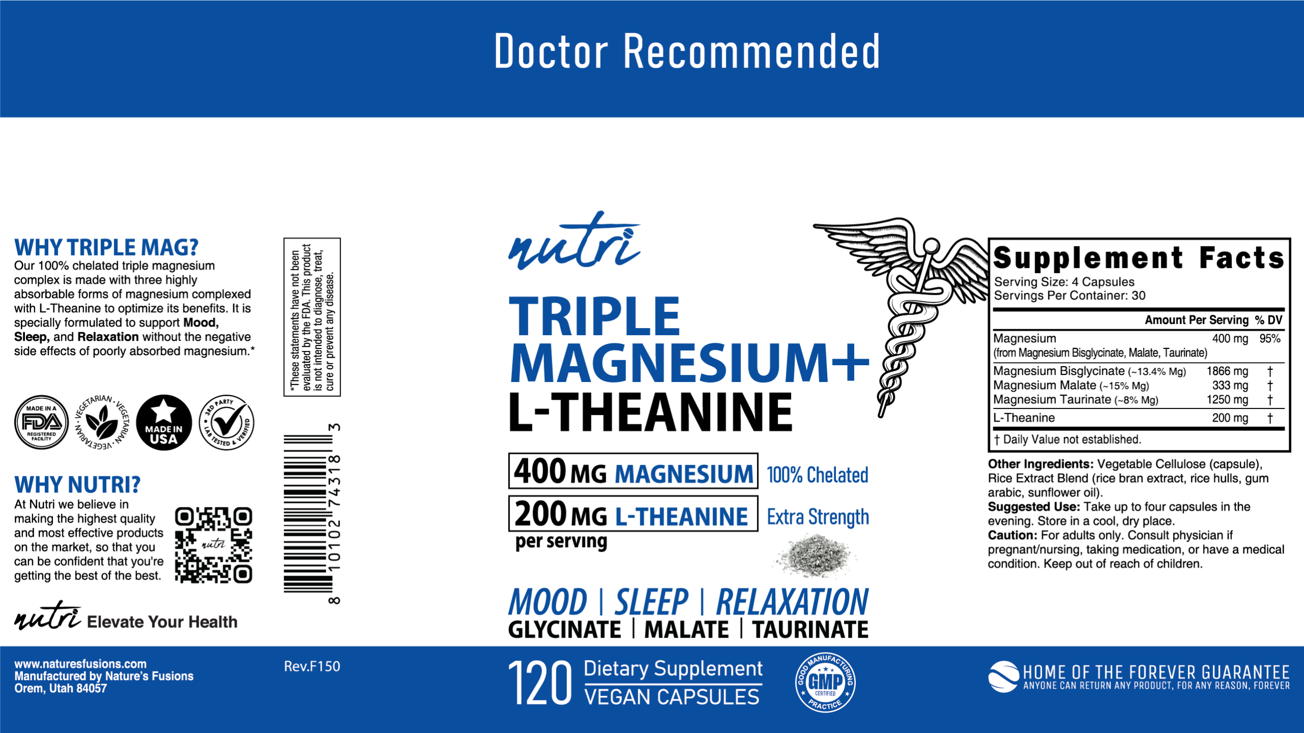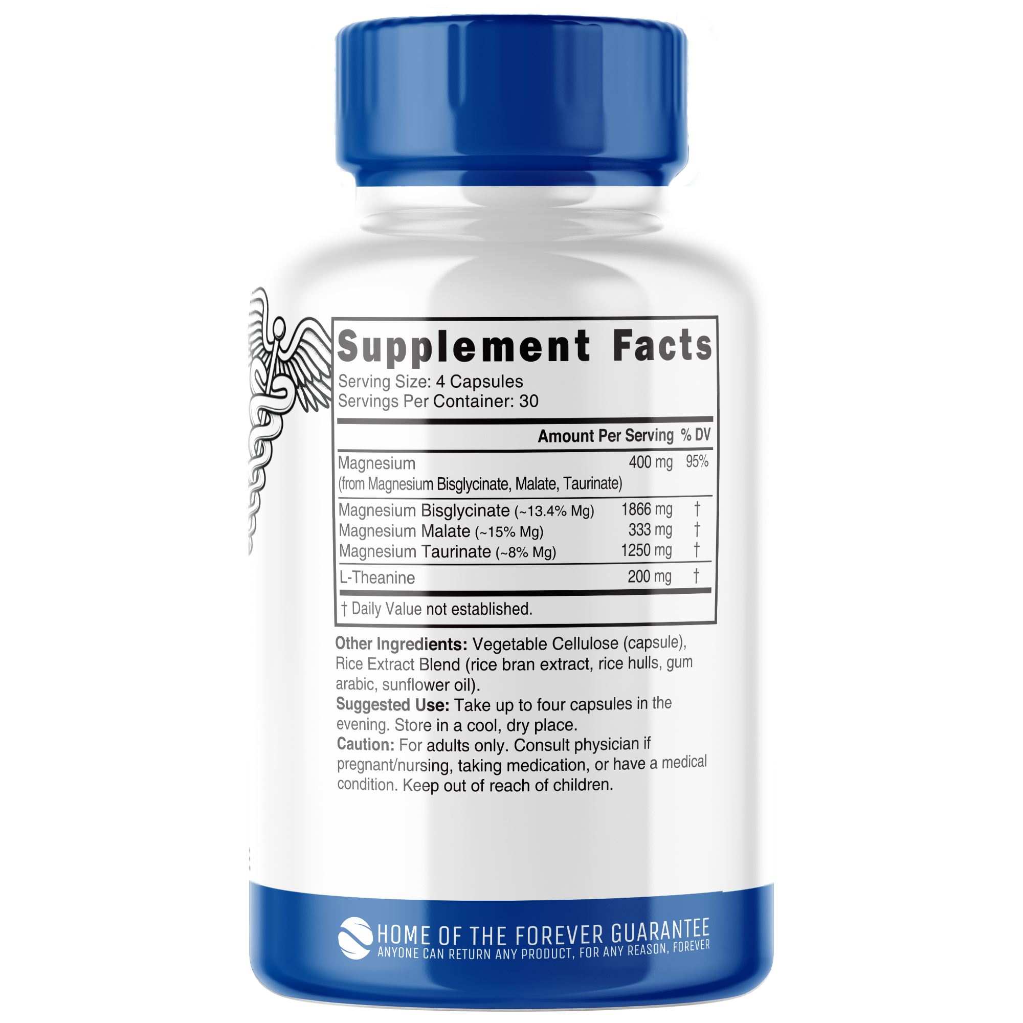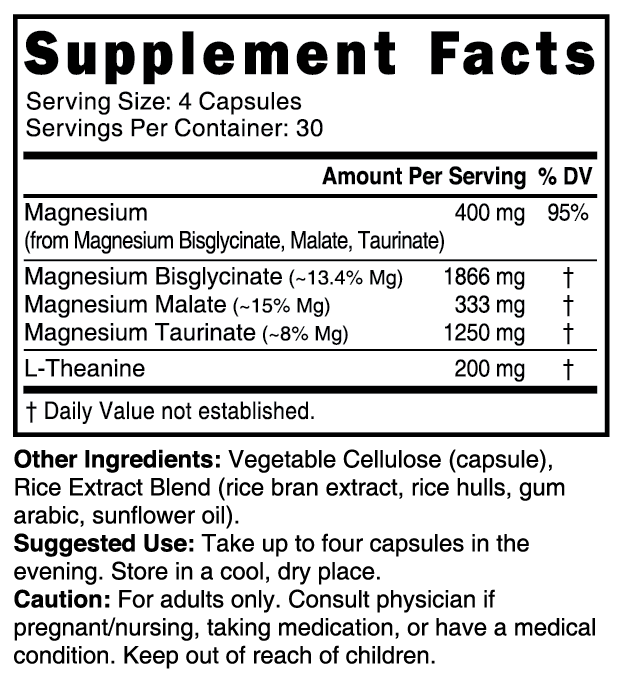 Each serving contains 200 mg L-Theanine and 400 mg Magnesium (from Triple Magnesium – Magnesium Glycinate, Magnesium Malate, and Magnesium Taurinate)